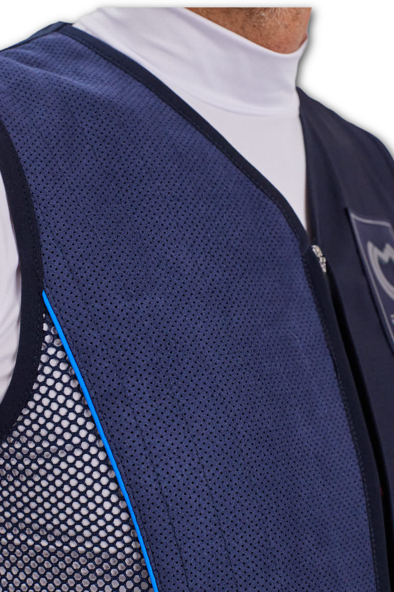 このテクニカル素材は、銃床との安定した接触をサポートすると同時に、肩周りの空気循環を向上させます。適度なグリップ力と高い通気性のバランスにより、本トラップシューティングベストのパフォーマンス特性をさらに高めています。